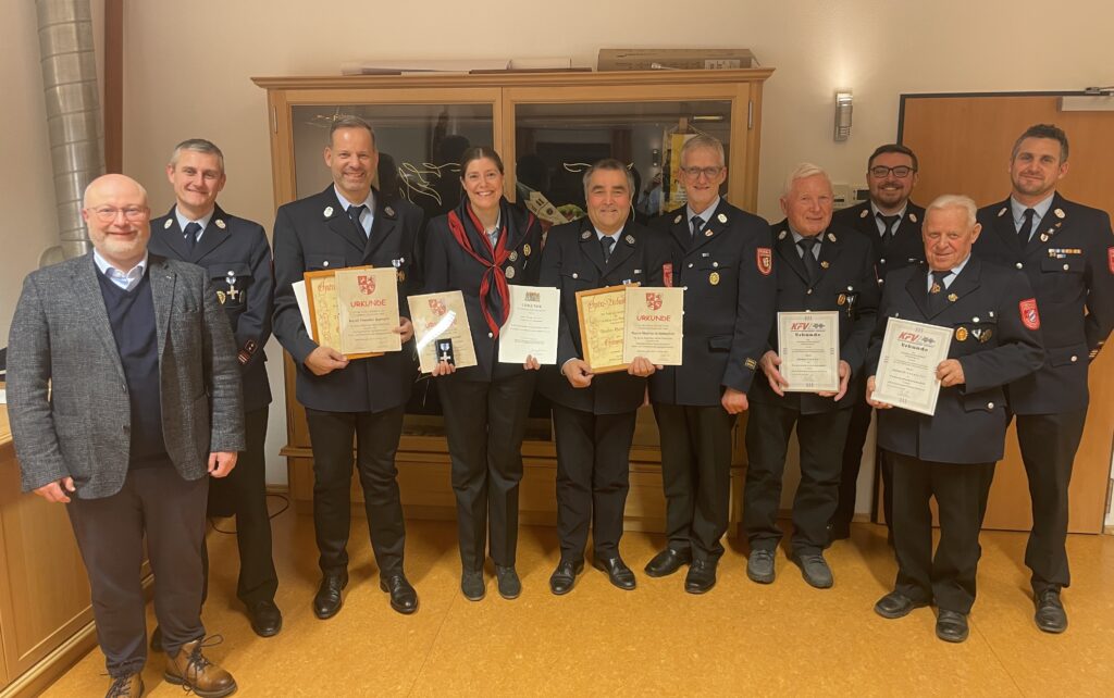 Von links nach rechts: Bgm. Ralf Wetzel, 1. Vorstand Christian Faith, Theo Aumann (40 Jahre), Manuela Fischer (25 Jahre), Werner Grimbacher (40 Jahre), KBM Elmar Müller, Johann Fischer (Ehrenzeichen), Philipp Seefried (stv. Kommandant), Herbert Kirchdorfer (Ehrenzeichen), Andreas Faith (1. Kommandant)